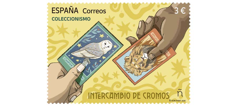 Madrid, 26 de marzo de 2026.- Correos rinde homenaje al coleccionismo con una nueva emisión dedicada al intercambio de cromos. El sello captura la esencia de esta tradición universal mediante la imagen de dos manos de distintos tonos de piel, sÃmbolo de inclusión, intercambiando las figuras de un búho y un león. Asimismo la pieza filatélica también refleja el valor social y la conexión personal que esta afición fomenta a lo largo del tiempo.