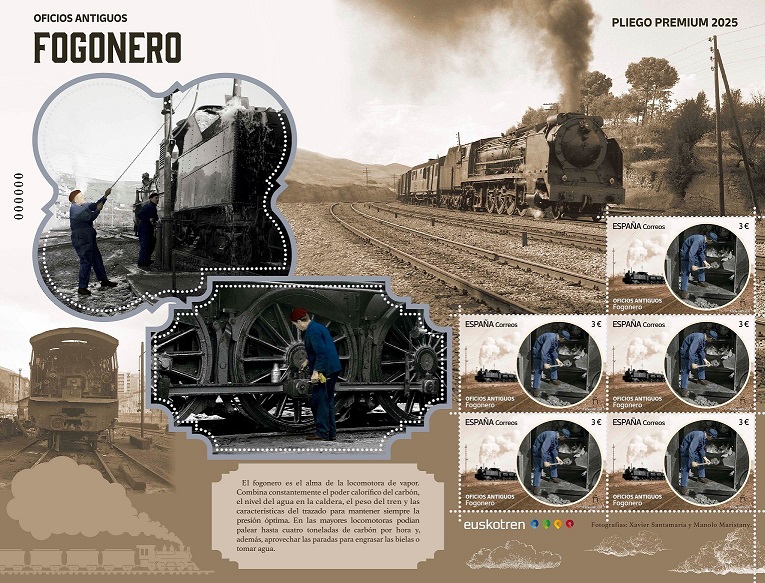 El sello dedicado al oficio de fogonero, dentro de la serie ‘Oficios antiguos’, busca evocar el arte y la habilidad de trabajos artesanales pasados. Se han emitido 70.000 ejemplares y 3.000 Pliegos Premium junto a una tarjeta enteropostal alusiva, con una tirada de 4.500 unidades.