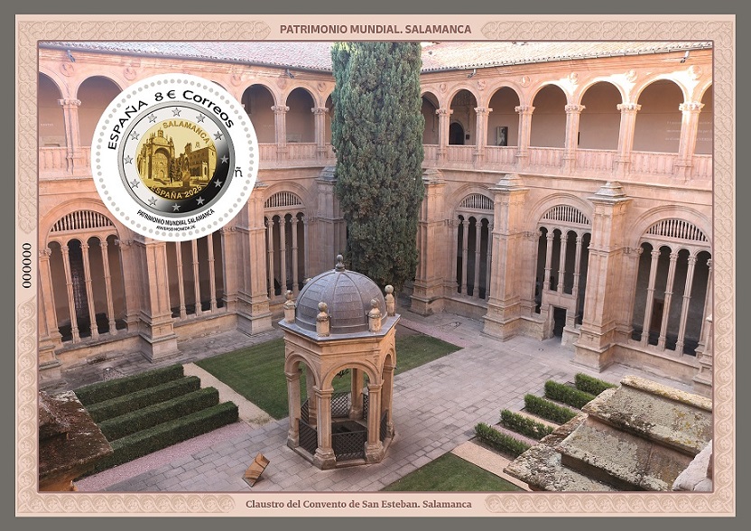 El Convento de San Esteban pertenece a la Orden de Predicadores o Dominicos, cuya presencia en Salamanca data del siglo XIII. El edificio actual conserva algunas partes del siglo XIV, mientras que el resto se construyeron entre los siglos XVI y XX. El sello recoge una imagen del claustro que fue contruido entre 1528 y 1544. La construcción de la iglesia se inició en 1524 y se concluyó en 1610; las esculturas de la fachada son del escultor italiano Antonio Ceroni, y el retrablo mayor es la obra cumbre de José de Churriguera. La Sacristía y el Capítulo Nuevo, de estilo barroco, se inauguraron en 1634 y 1636, respectivamente. El conjunto arquitectónico del convento es de gran valor.