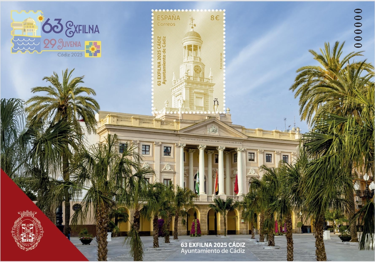 El sello de EXFILNA está dedicado al Ayuntamiento de Cádiz. Este emblemático edificio conserva su ubicación original desde el siglo XVI y su actual construcción, levantada en 1799 sobre las antiguas casas consistoriales, combina elementos arquitectónicos de estilo neoclásico e isabelino, este último incorporado en una segunda etapa realizada en torno a 1865. Destaca por su rica arquitectura exterior e interior, con elementos como la torre manierista, el Salón de Plenos y la escultura de Hércules. La emisión, en formato de hoja bloque, se complementa con una prueba de artista de tirada limitada a 11.500 unidades, que reproduce el sello en oro. Se trata de piezas únicas por su escasa tirada, su excepcional tratamiento y su alto valor estético.